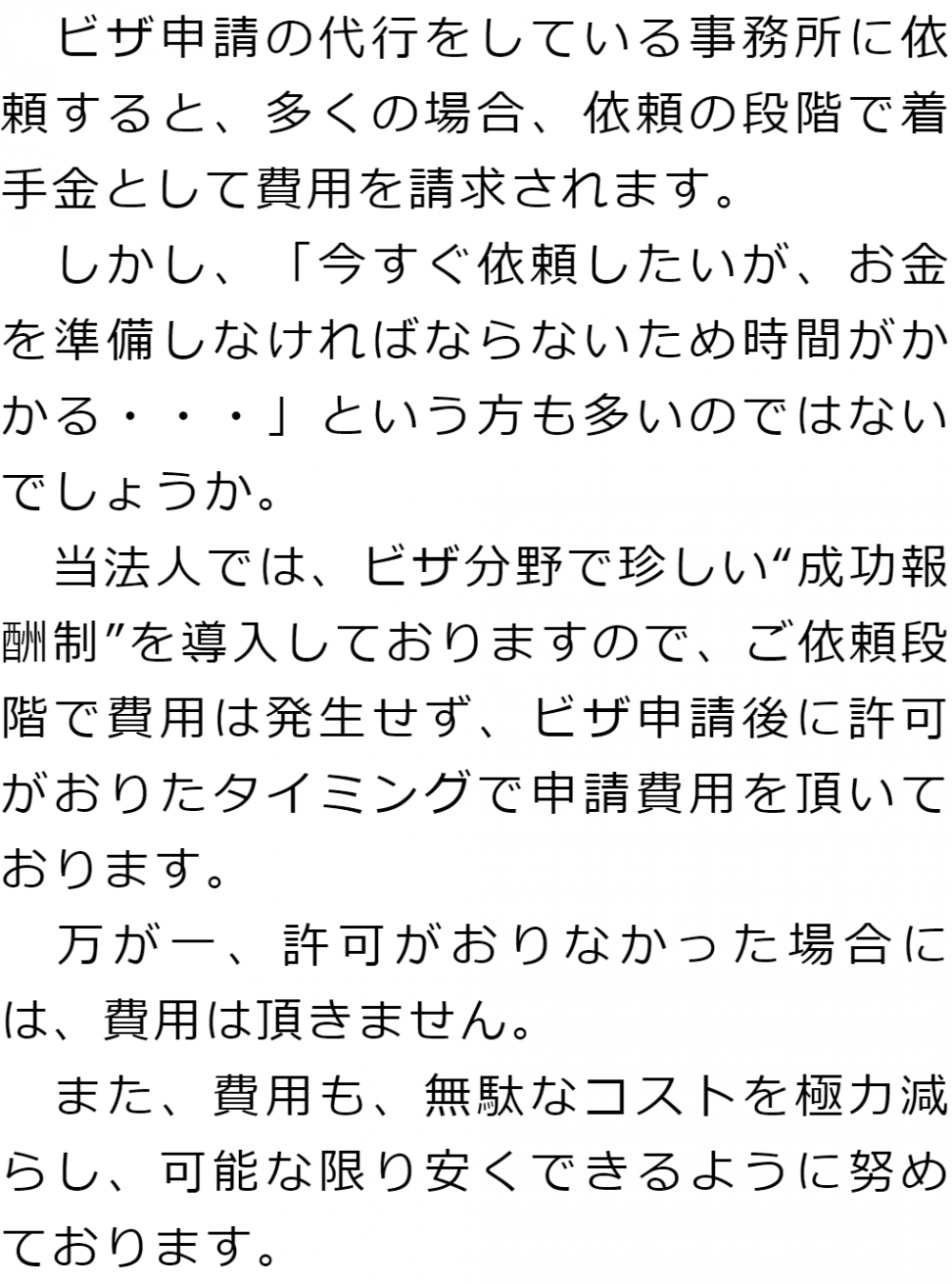1 ビザ(在留資格)に詳しい取次資格者がサポート! 2 初期費用0円!許可がおりてからお支払いいただく“成功報酬制”! 3 スピーディーな申請準備!面倒な書類収集も代行! 4 休日・仕事終わりでも相談できる! 5 外国人経営者・外国人雇用企業のご相談も対応可能!